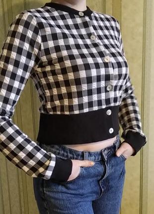 Кардиган в клетку. Новый с этикеткой. Замеры, см: плечи - 37; ПОГ - 42; ширина низа - 39; длина по спинке - 45; длина рукава от плеча - 64.