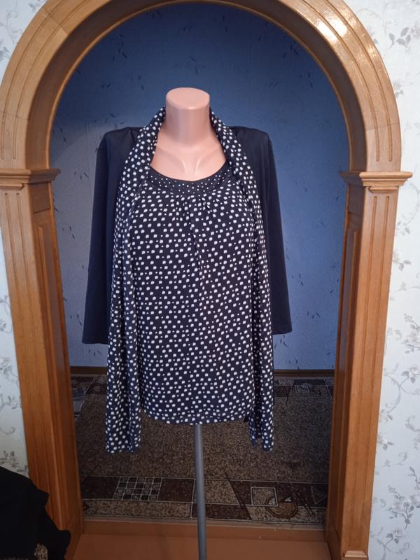 довжина по спині без воротніка 60 см ширина під рукавами 55 см ширина в плечах 41 см довжина рукава 44 см (3/4) тканина однотонна темно синя тягнеться тканина в білу цятку, не тягнеться бірка з розміром відсутня, орієнтуйтесь по замірах *518