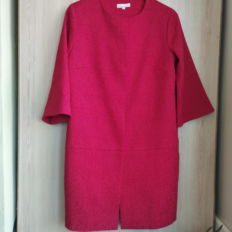 Красивого красного цвета, на фото более малиновое показывает. Не яскраве. Фактурна тканина. На подкладке. С карманами. С коротким рукавом. Ширина 48см, длина 85см, рукав 41см. Украинский производитель Pink