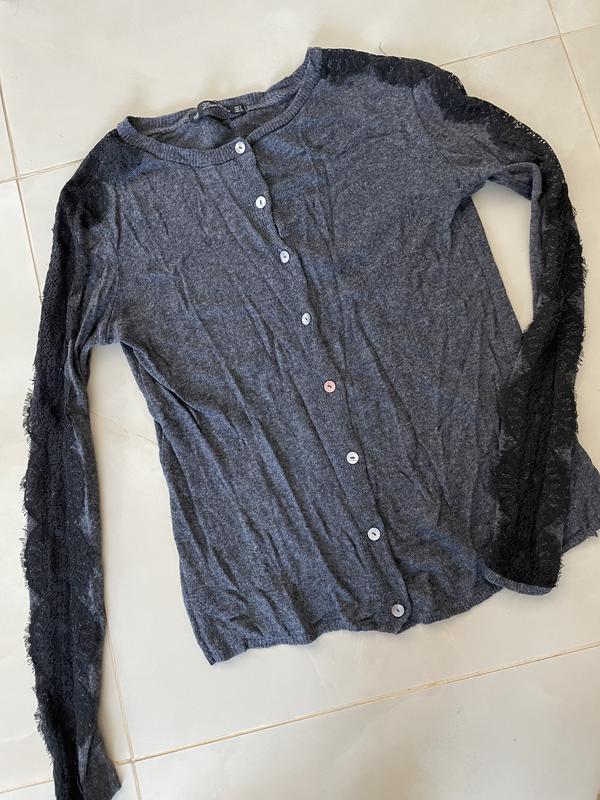 Очень красивая кофта на пуговицах, цвет серый Стан - идеальный Перламутровые пуговички, украшенные рукава гепюровыми вставками. Размер s В составе 10% Ангоры