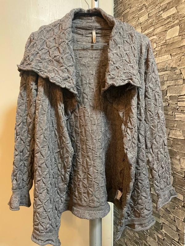 Приємний на дотик, теплий, цікавий узор в"язки. Довжина 70см, ширина задньої полочки 42см, ширина кожної частини переду по 35см, довжина рукава 61см.