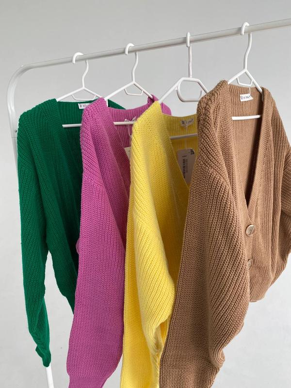Укорочений кардигад Тканина: трикотаж Турція Колір: жовтий, зелений, малиновий, мокко, молочний Розмір: універсальний (42-46) Арт 0136 🔥Ціна 830 грн Трендовий укорочений кардиган машинної в’язки в неймовірних кольорах. Светр на гудзиках, ідеально на осінь 📐 Довжина 51 см, довжина рукава від шва 55 см, ОГ до 100 см