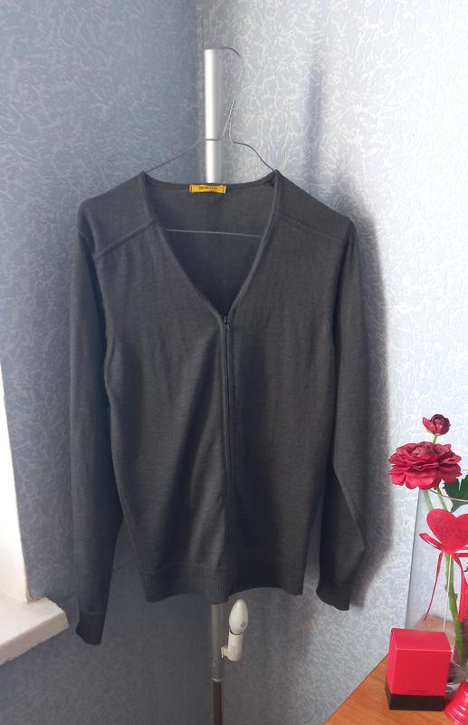 Кардиган с V-образным вырезом. Стильный, минималистичный, без карманов и декора. Цвет темно серый, графитовый. Застегивается на молнию УКК спереди. Состав: 60% шерсть, 40% акрил, теплый, не колется. Особенно хорошо будет смотреться в тотал серых луках или со светлым низом. Размер ХS, подойдет на S, М. На фото надет на размер М. Рукав длинный, свободный. Ширина в плечах 37 см, длина 66 см, рукав 66 см