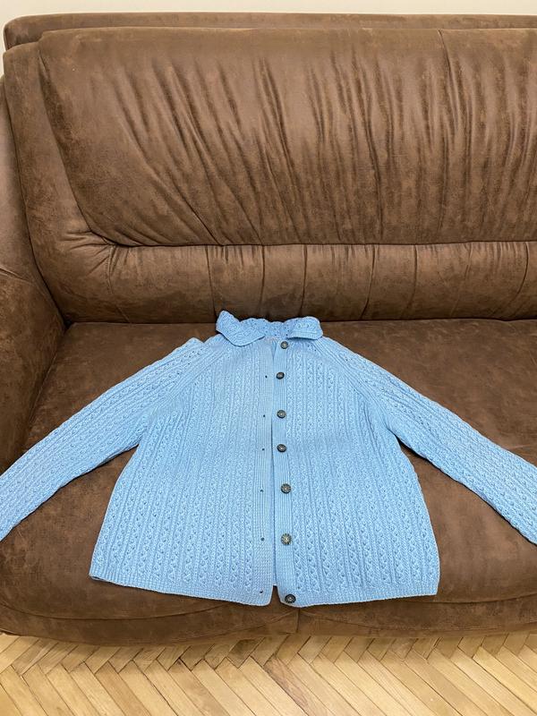 Кофта кардиган. Колір голубий. Ручна в‘язка. Полуобхват грудей 54 см, висота спинки 58 см, довжина рукава від шиї 70 см, від плеча 51 см.