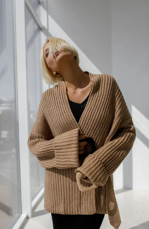 Кардиган прямого и свободного силуэта, цвет бежевый, широкие прямые рукава, линия плеча приспущена. Длина изделия 65 см. Состав 70% акрил, 20% мохер, 10% шерсть. Кардиган новый, ни разу не был одет, но отсутствует бирка. По размеру 48/52 (идет как оверсайс). Производство Украина.