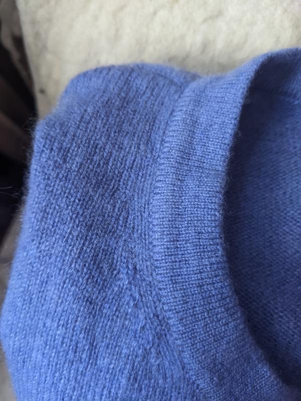 очень нежный кашемир,м, мочка,гарный цвет небеснолиловый,без следов носки и катишек,но ведь зашитые места.Но очень красивая,розкошная и невероятно мягкая.Цвет, как на первых фото.Довга,закрывает попу.