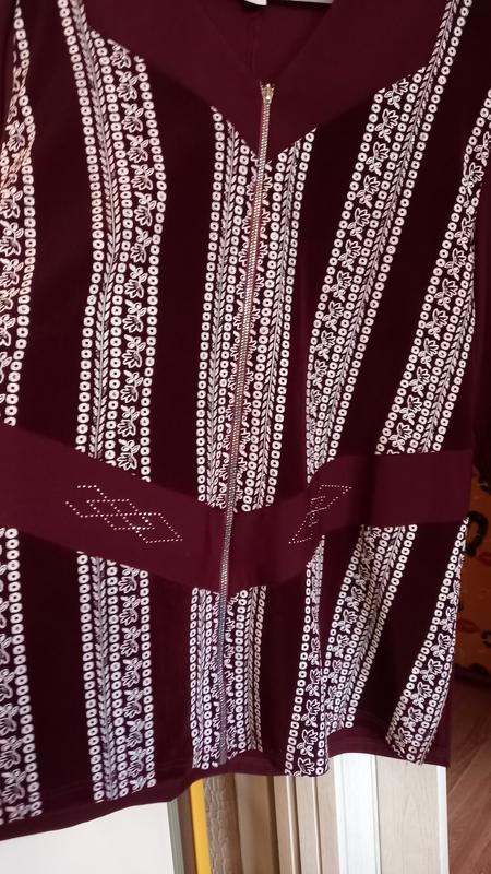Размер 58 Замеры ОГ - 120 + ОТ - 116 + ОБ - 120 + Длина по спинке - 76 длина рукава - 64 Ткань французский трикотаж, вставка из трикотажной жатки, хорошо тянется. На молнии, вставки с узором, ткань приятная к телу. На модели размер комди и бедер 130 Состояние хорошее, без дефектов