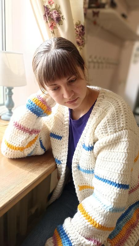 Теплый весенний кардиган в цветную полоску. Ручная работа 💯. В наличии. Размер оверсайз. Размер модели - L. Новый.