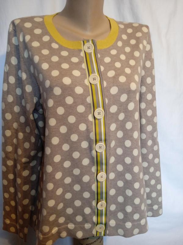 кардиган красивый, мягкий, нарядный,без дефектов,цвет бежевый,горохи белые,хороший состав трикотажа, Длина61, пог48,рукав62см