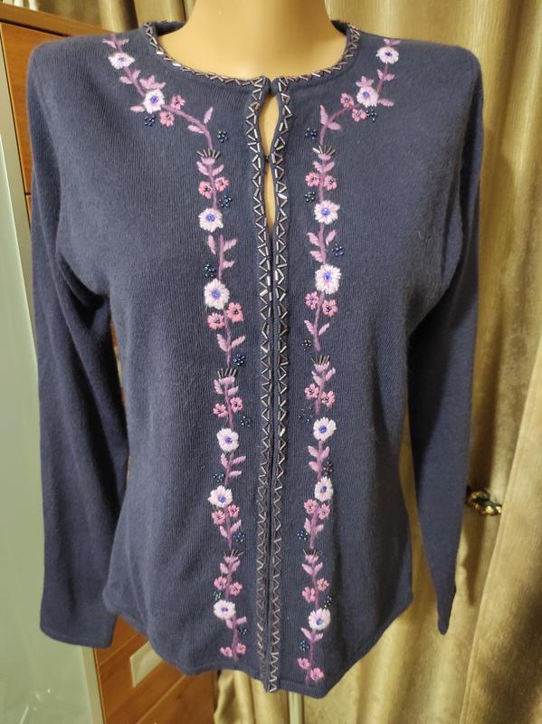 Кардиган очень стильный, вышивка бисером и пайетками.Колир фиолетовый.Состав 100%-акрил.Замеры:Длина 58 см;Полуобхват груди-48см;Плечи-36см;Довжина рукава-60см;Пройм-22см.