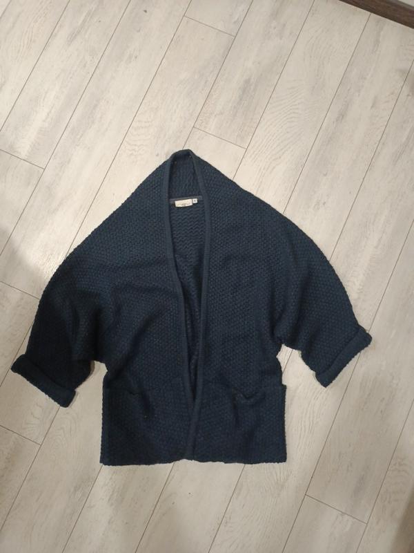 Синий кардиган без пуговиц. Имеет два кармана. Размер указан 10, подойдет и на 12.