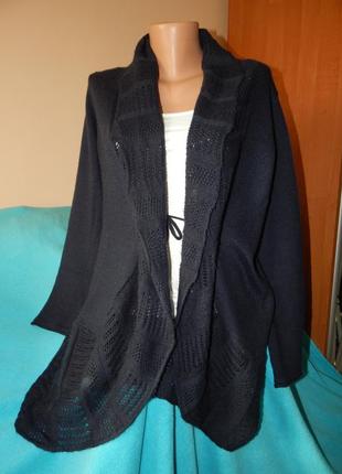 М’який, теплий, пухнастий. ПОГ 52см по спинці, полочка на рівні грудей 45см, рукав 61см, плечі 38см, довжина 86см. Темно синій колір, добре тягнеться.