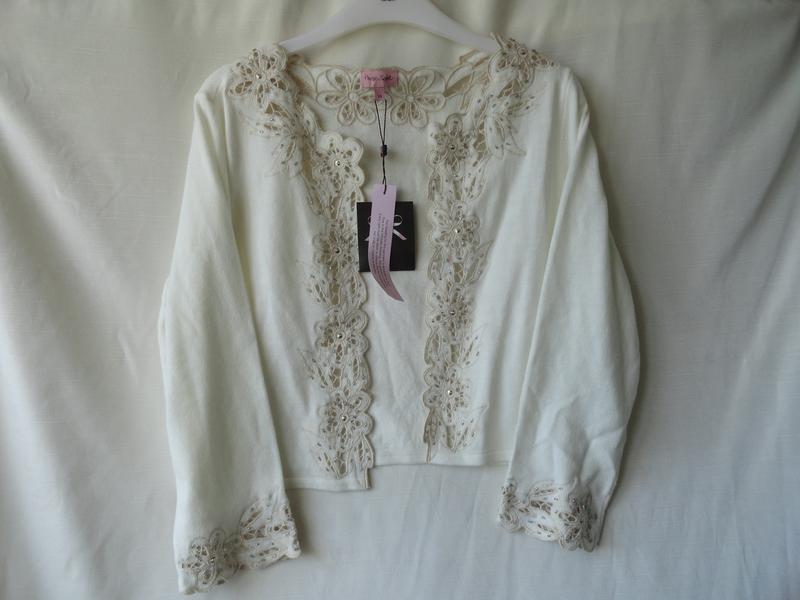 Нарядная трикотажная кофточка по типу болеро, украшена вышивкой ришелье, нежно кремового цвета.Замеры : плечо - 8 см, рукав - 49 см, длина по спинке - 43 см. ширина между рукавами - 36 см. все замеры на фото Заходите в мой профиль там много вещей: покупательницы,футболки, топы, лонгосливы,светри, сумки,ремешки, обувь, бельё , сукние,блузы, рубашки,детские вещи,спортивная одежда,аксессуары.