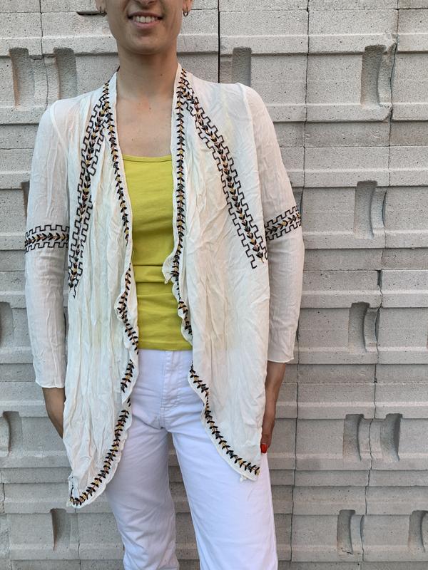 Тоненькая накидка, вышитая бисером, без карманов, молочного цвета. Вещь новая, с биркой. Рост модели 170