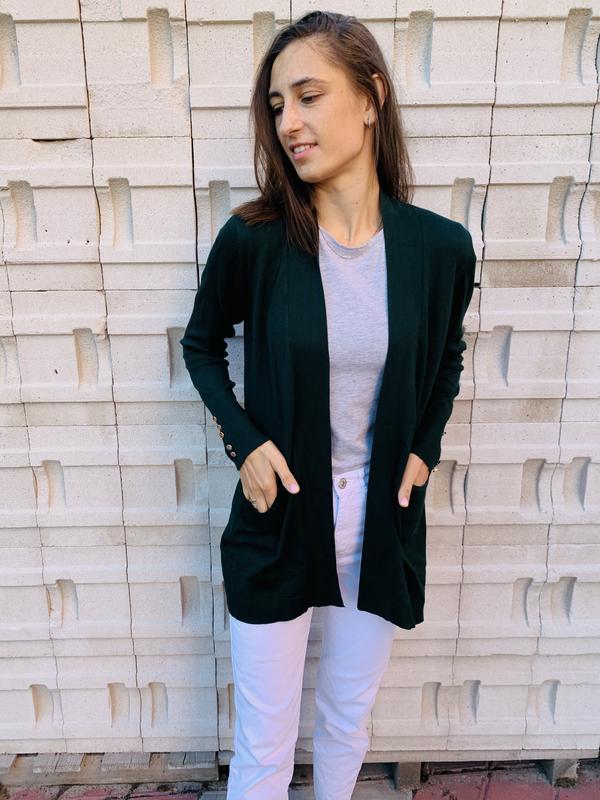Кардиган без пуговиц, с карманами, приятная на ощупь. Цвет: темно-зеленый. Вещь новая, с биркой. Рост модели 170 см.