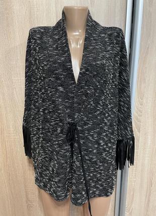 Красивый оригинальный кардиган на завязке, рукава отделаны бахромой из тонкой искусственной кожи. Производитель- Франция.Футболки - блузы тоже в наличии.Guess- 290грн, размер М, с пиратом)-200 грн, размер М, L.