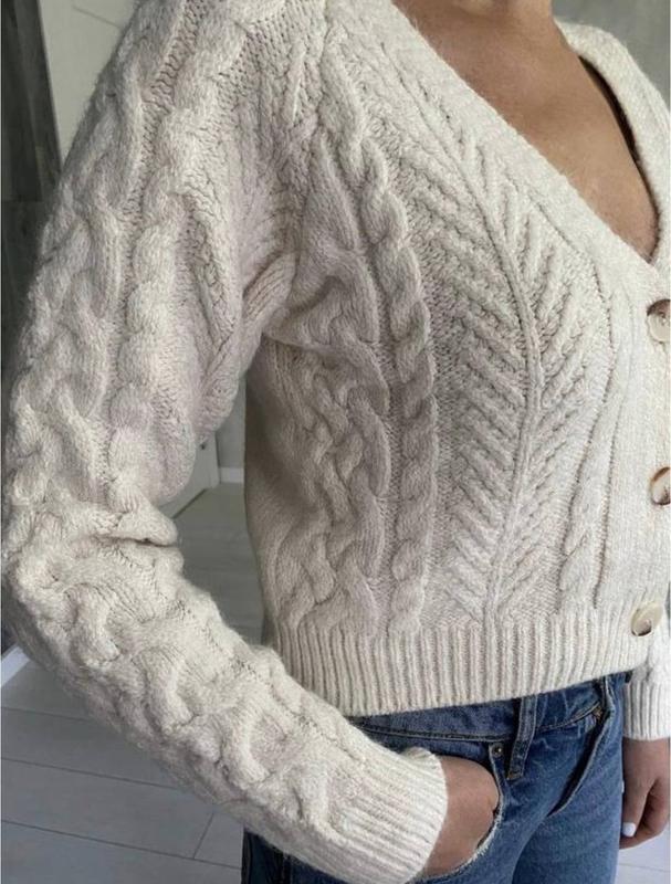Кардиган молочного цвета на пуговицах Размер S Длина по спине - 48 см длина рукава - 62, от горловины длина реглана 62см обхват грудей - 94 см обхват талии - 80 см состав ткани 88%акрил,6% - полиэстер,6% - полиамид