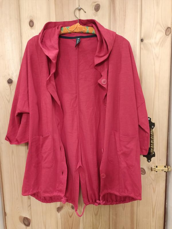 кардиган с капюшоном,на пуговицах, по низу стягивается шнуром.есть карманы два.Multibli.