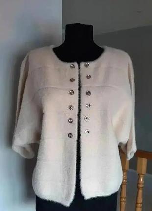 Кардиган пудрового цвета из 100% ангоры. Теплый, мягкий, красивый, цельнокирийный рукав. Кардиган не застегивается, пуговицы для декора. Размер от S до М. Замеры: от проймы до проймы-55 см, длина рукава от горловины-40 см, длина по спине-50 см.