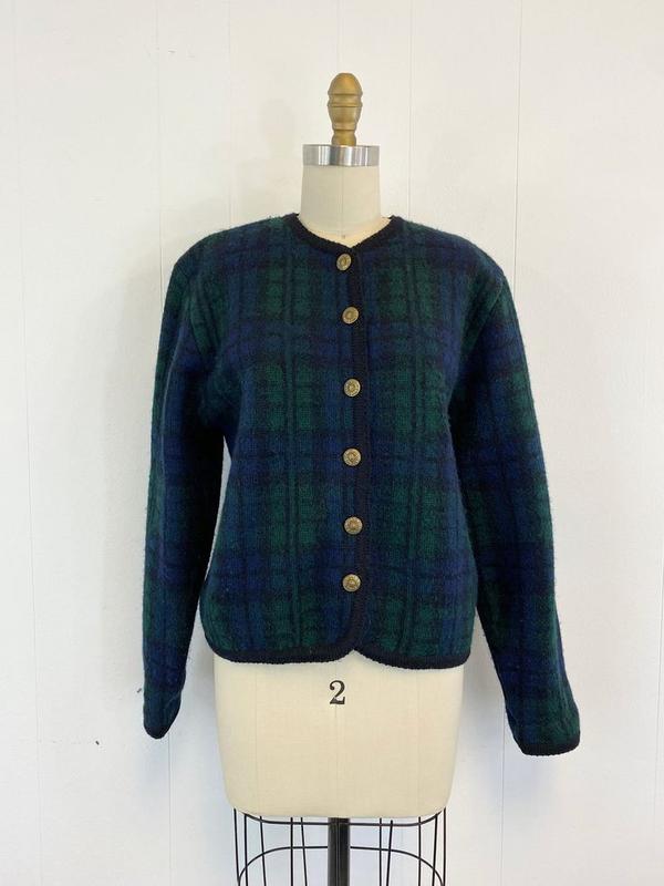 Винтажный кардиган из 100% шерсти от шотландского бренда Jamie Watson. Передние полочки в сине-зеленую клетку. Оригинальная металлическиая фурнитура. В комплекте есть запасная пуговица. Состояние идеальное, без каких-либо ньюансов. Замеры: ПОГ 54 ПОТ 54 ПОБ 51 Длина 60 Длина рукава 52 Плечо 15 Ширина плеч 40