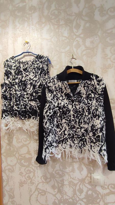 Комплект з двух речей( кофта + топ) . Кофта на подкладке и пуговицах, трикотажные рукава, топ на подкладке со стороны молния. Кофта ПОГ55, ПОС55, плечо 13, длина рукава 84 (сворачивается как манжет), длина по спинке 60. Топ ПОГ52, ПОС55, длина по спинке 55.