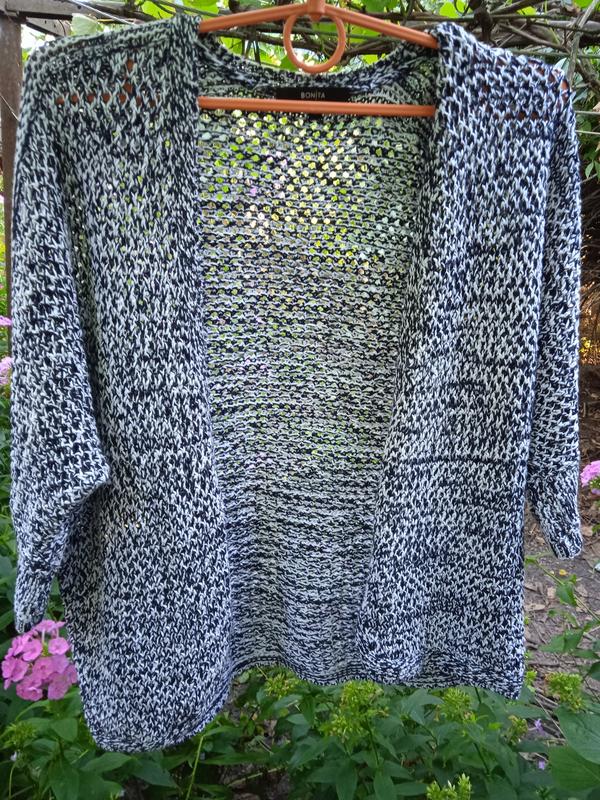 Кофта кардиган укороченный бренд Bonita крупная вязка актуальный чёрно-белый меланж состав 100% коттон размер указан XL, визуально будет хорошо и на L, XXL длина 64 рукава цельнокроеные оверсайз ширина подмышками примерно 75 Состояние отличное, визуально и по биркам состояние новой вещи.