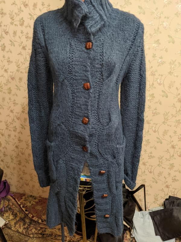теплый кардиган,чаговый цвет, красивая в, погремушка,воротника вы сокий, способная выкладывать по разному,цвет синебирюзовый