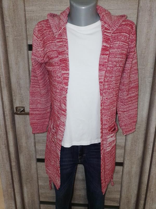 Легкий кардиган, удлиненная кофточка,рукав 3\4,е поясок,но можно носить и без него, на такую же погоду, как сейчас, подойдет на С,невеличку М