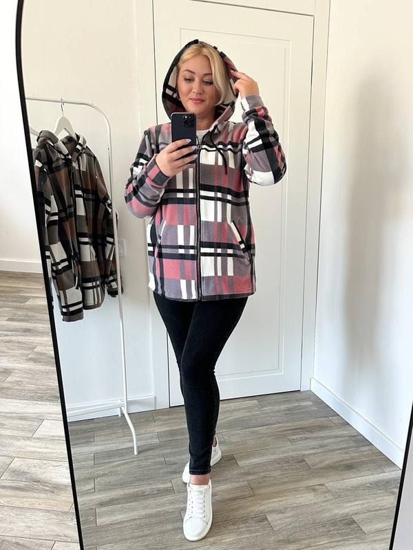 Кардиган ▪️Ткань: флис принт ▪️Цвет: розовый, карамель ▪️Размер: 48-50, 52-54, 56-58 Кардиган на молнии, с капюшоном и карманами