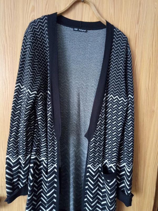 Кардиган длинный, черно-белого цвета, есть карманы, не застегивается.