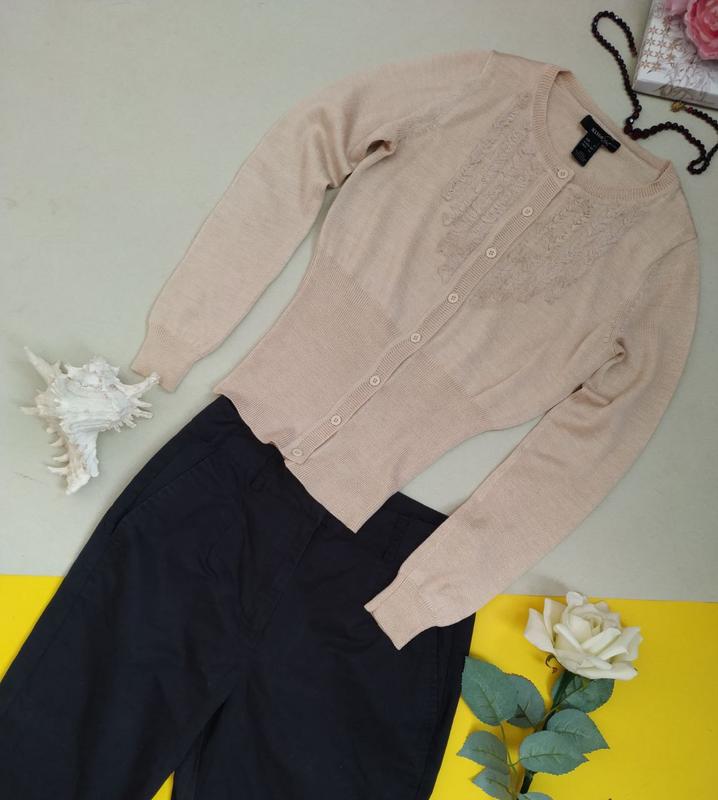Очень красивое цвета беж, приталенная,рукав длинный, декорированная шелковыми полосками, нежная на ощупь и приятная к телу Размер S Длина 54см ПОГ 42-44см (тянется) Длина рукава 60см Плечи 30см Стан - идеальный