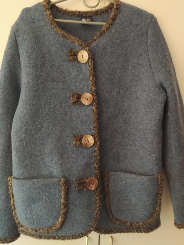 Жакет, пиджак, кофта из шерсти. .Шерсть типа валяной .Ткань толстая, ,,стоячая,, Пуговицы большие 4 см и толстые 0.5 см. , из рога животных. Цвет сине -серый, серо- голубой. 1, 2 е фото ~ соответствует реалу. Теплая. Чуть ли ни валянок.