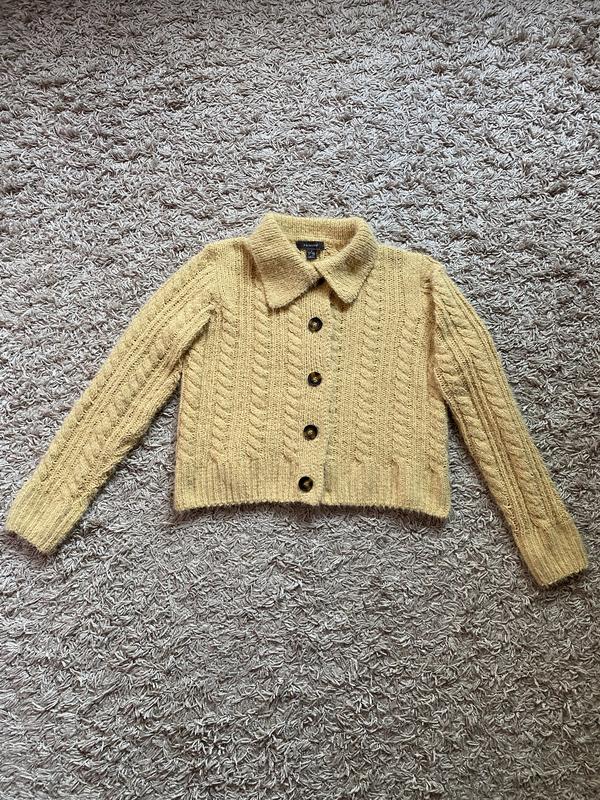 Кофта-кардиган вязаный, женский, на длинный рукав, прямого кроя, застежка - пуговицы коричневого цвета спереди кардигана по всей длине, фасон - оверсайз, нежного желтого цвета, из приятной на ощупь мягкой ткани (мелкой травы), отлично подойдет под любой низ (джинсы, юбку, классические брюки, шорты,...), можно надевать как самостоятельно так и под футболку, блузу или рубашку. Размер - S (10/12-38/40- крупномерит на М). Бренд - Primark