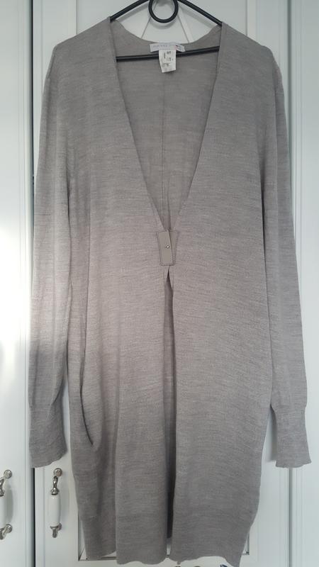 Стильный кардиган кофта из 100% тонкой шерсти мериноса Fabiana Filippi. Длинный рукав, глубокий v-образный вырез горловины. По бокам есть карманы. Застежка из кожи по центру. Тонкая, но теплая пряжа. Размер указан М