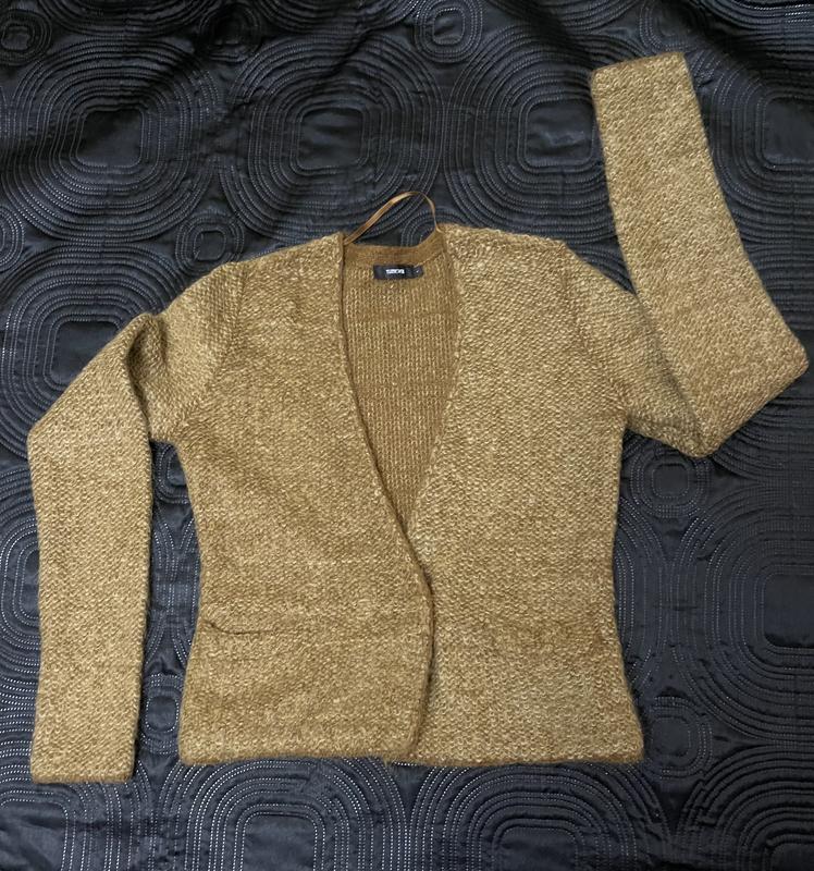 Кофта кольору гірчиці. Бренд Turnover. Розмір L, маломірить. Краще на S/ M. Плечі 40 см, ПОГ 48 см, довжина 56 см. Мохер/ вовна/ полігамід ( склад - див. Фото). Застібка - кнопка. Нова, без дефектів.