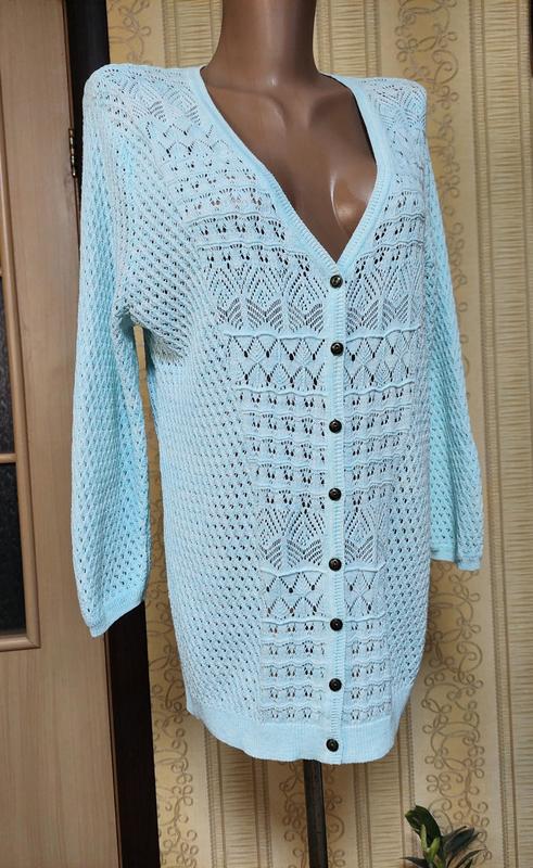 Классный, нарядный, брендовый кардиган. Невероятно красивая ажурная вязка, необыкновенно красивый цвет мятный(небесный). Ткань мягкая, нежная, приятная на ощупь, хорошо тянется. Длина 70см, пог 52см, рукав 53см, низ резинка 47см.