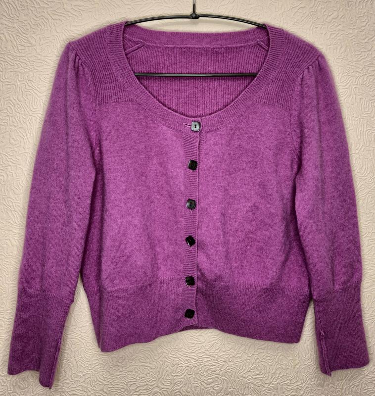 Женская кофта (кардиган) от Marks & Spencer в хорошем состоянии. Размер указанный UK 14, но пойдет на xs или s (см. замеры). Из недостатков - есть зашитая небольшая местность с левой стороны, на фото показала (на самом деле не заметно в процессе носки). Рукав можно делать 3/4. Цвет приятный лавандовый, на фото немного ярче смотрится. Состав 100% кашемир Полуобхват груди 44 Длина 47 Длина рукава 48,5 Ширина плечей 34,5