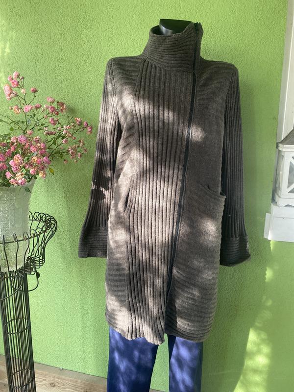 Стильный кардиган от Sarah-Pacinи. Цвет - коричневый. Асимметричная застежка на молнию, два кармана разной конфигурации, рукав мягко подлистывать. Бирка с размером и составом отсутствует. Замеры: длина-92 см, ПОГ-52 см, ПОБ-54 см, рукав-63 см. В составе есть шерсть.
