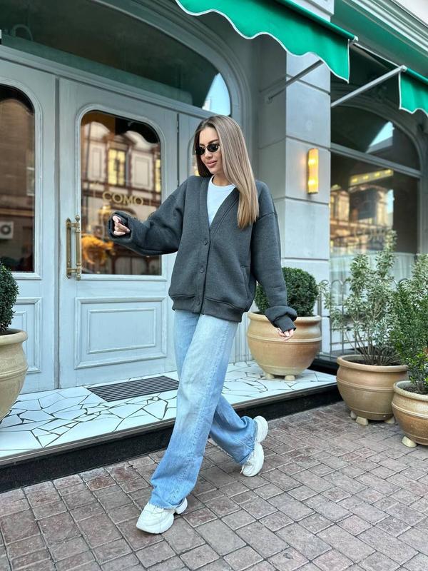 Арт 1333-144 Фото Реал Кардиган ▪️Ткань: турецкая троехнитка на флисе ПЕНЬЕ (мягкая, не кашлатится, не теряет цвет) ▪️Размеры: 42-44,46-48. ▪️Цвета: серый,темно серый. Цена 1100 грн Манжеты зерна.