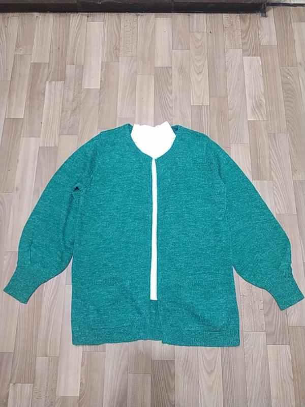 Кардиган зеленого цвета без застежек, тонкий, но теплый, с двумя карманами, рукав широкий, ширина спинки ниже рукав 53, длина по центру спинки 71, рукава 62