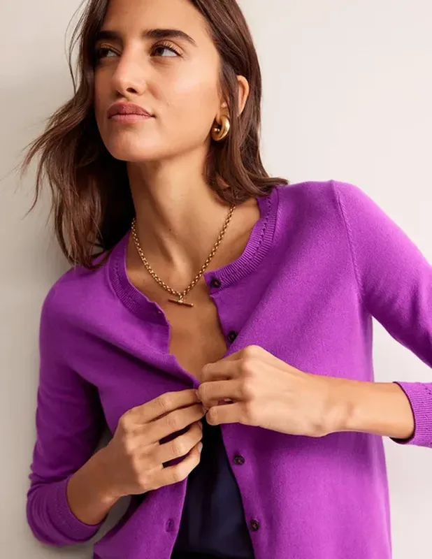 Тоненька кофта з шерсті від Boden. Виробник вказує розмір UK-14 Маломірить Розміри виробу в спокійному стані: Напівокружність грудей-46 Довжина рукава від шиї -74 Довжина кофти-63см Колір бузковий