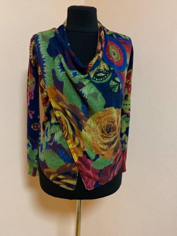 Классная, бренд испанский, убранная из Малаги, один раз одетая, размер ХС указан. Длина - 56см, плечи - 39см, рукав от плеча - 60см, пог - 44см по спинке, до низа прямая. Фасон на запах с закреплением замочком на правом плече.