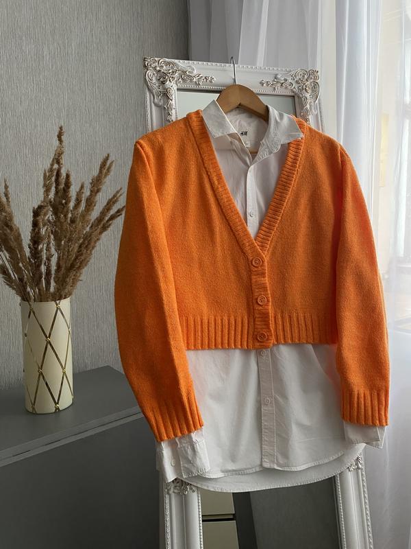 Яркий оранжевый укороченный кардиган H&M, размер указан l, красиво будет в меньшем, замеры по запросу да 😉 В подарок отдам рубашку белую на фото