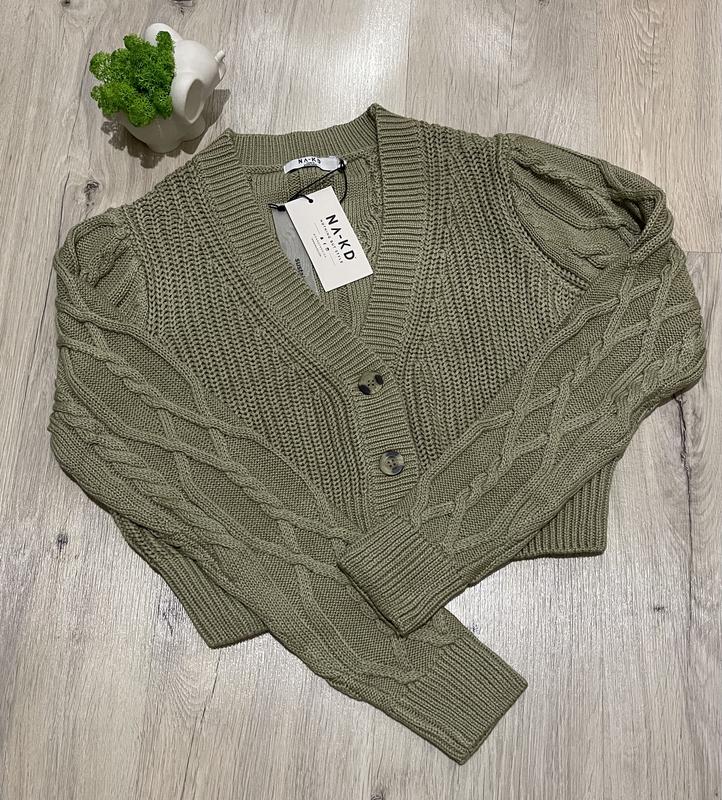 Кардиган вʼязаний в рубчик та з гарним візерунком на рукавах і спині від Na-kd в кольорі - світлий хакі ( на моделі - зелений) в розмірі S, підійде й на M Заміри: ширина - 49 см, до низу - 38 см, довжина - 42 см, рукав від плеча - 63 см