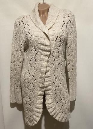 Ажурный женский кардиган Размер - написано 18 но маломерит Ширина (по груди) - 52 см Ширина (по бедрам) -55 см Длина - 84см Рукав -62см В состав входит 15% -шерсть цвет молочный, есть петли для пояса, пояса нет, может найду наподобие