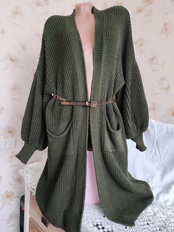 Шикарный длинный кардиган темно-зеленого цвета с объемными рукавами. Цвет, как на первых фото. Смотрится очень эффектно и стильно. Крупная рельефная вязка. Спереди на планке, без застёжки. Спущенная пройма, длинный рукав. Два функциональных кармана. Отлично смотрится под пояс . Состояние идеальное. Дефектов нет.