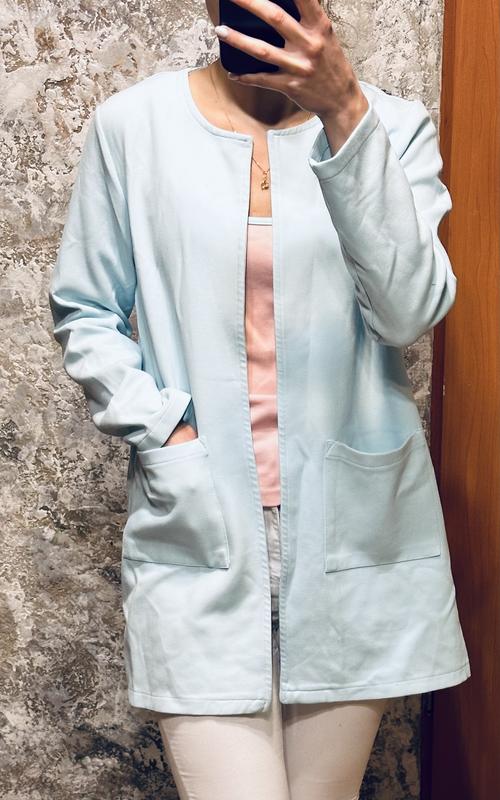 Голубой Кардиган Имеет накладные карманы Без пуговиц Размер М Новый, без бумажных бирок ВНИМАНИЕ ДЕФЕКТ пятнышка на спине (на фото) отстирывается В связи с закрытием магазина продаются остатки товара, поэтому бирки на некоторых товарах отсутствуют