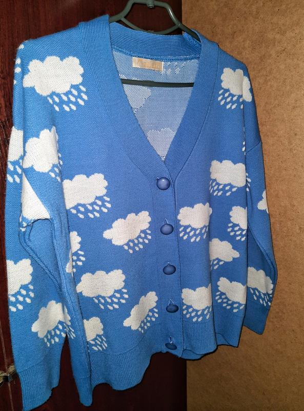 Теплый женский кардиган голубого цвета с принтом в виде тучек. Длина вещи от плеча 62 см. Подойдет на размеры S/M