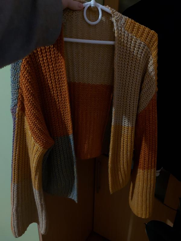 Дуже гарний кардиган,рукава донизу йдуть ширші. Довжина позаду трохи коротша. На бірці пише розмір С,але я М-Л,сідає також чудово! На вішалці виглядає куцо,але на тілі чудово сідає,пряжа нормальна,тому виглядає недешево.