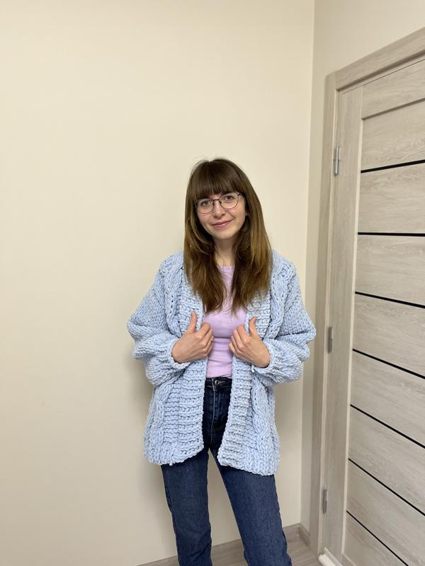 Кардиган Нитки: alize puffy Розмір S/M Колір дуже гарний, змінюється від освітлення, від сірого до блакитного Можу сплести індивідуально під вас будь-який розмір чи колір